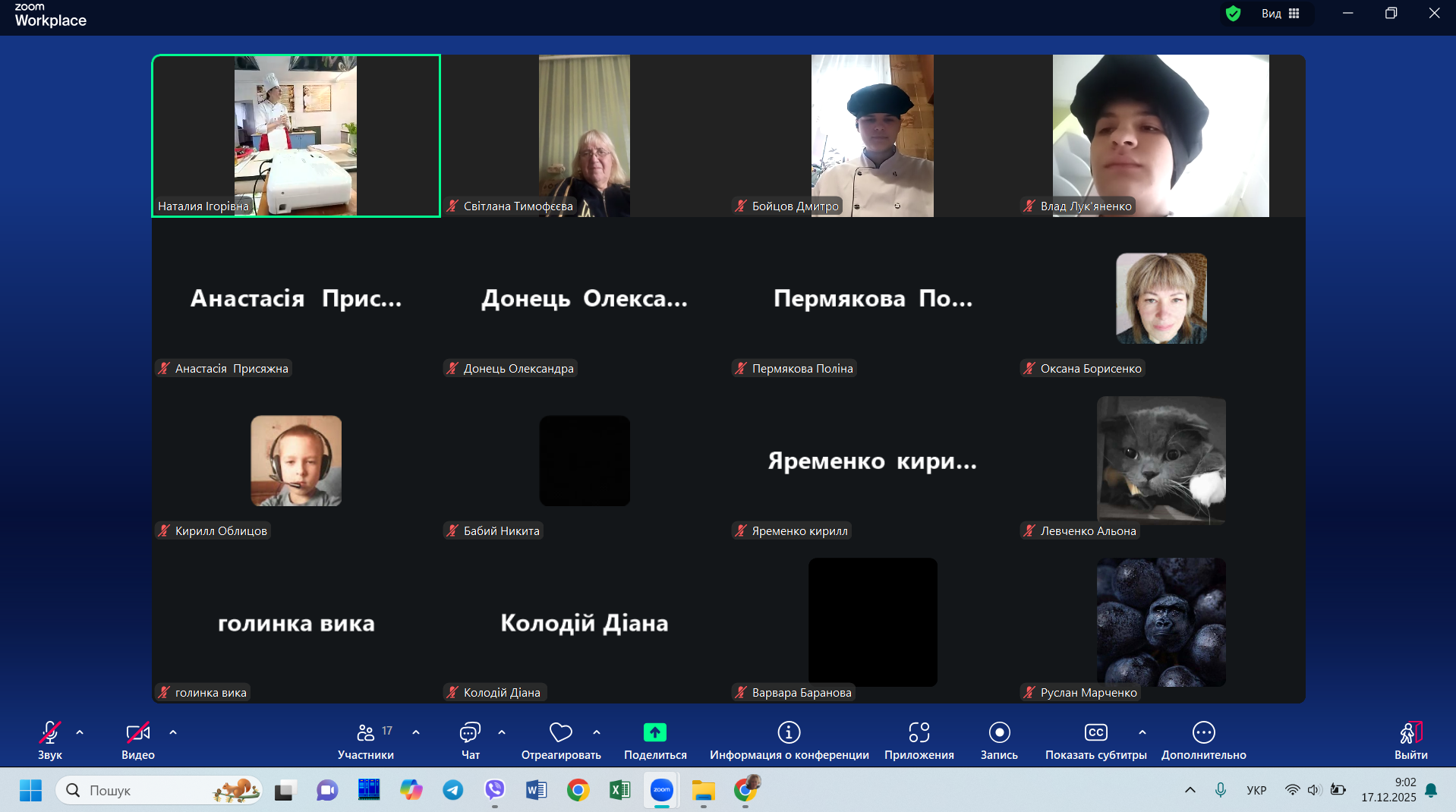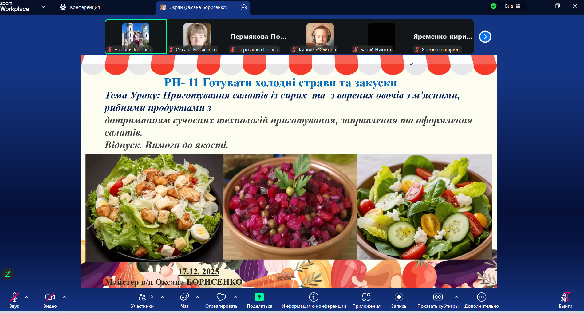 17 грудня 2025 року майстер виробничого навчання Оксана БОРИСЕНКО провела відкритий урок у своїй групі КК-22 (другий курс, професійна кваліфікація - кухар 4 розряду). Тема уроку: "Приготування салатів". Урок проведено на високому методичному рівні, дотримано всіх етапів класичного уроку виробничого навчання. Форма проведення уроку - дистанційна. Пані Оксана продемонструвала досконале володіння технологією, вчить своїх студентів творчому підходу до приготування страв. На етапі вступного інструктажу використовувалася електронна презентація, інтерактивна вправа. Проведений урок може слугувати зразком уроку виробничого навчання у дистанційній формі.