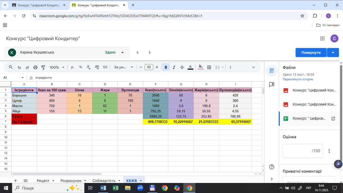 У середу та четвер проводився День Рецепту та Калькуляції (Фокус на Кухарях). У конкурсі прийняли участь 25 здобувачів освіти. Умови Конкурсу "Цифровий Кондитер": Математика: Розрахунок собівартості страви, перерахунок рецепта на іншу кількість порцій (пропорції), визначення КБЖВ. Інформатика: Створення технологічної картки у Google Таблицях або Excel з автоматичним перерахунком. Найкращі результати показали: Карина Якушевська та Владислав Лук’яненко – група КК-22.