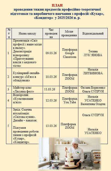 09 березня 2026 року відповідно до плану роботи методичної комісії викладачів та майстрів в/н розпочався тиждень професії кухар-кондитер.