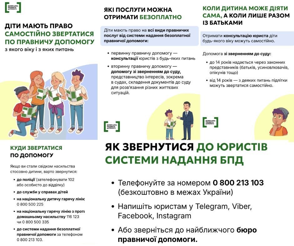 З якими юридичними питаннями можуть стикатися діти, як отримати допомогу юриста чи адвоката безоплатно та з якого віку можна звертатися самостійно — у картках, підготовлених системою надання безоплатної правничої допомоги (БПД).